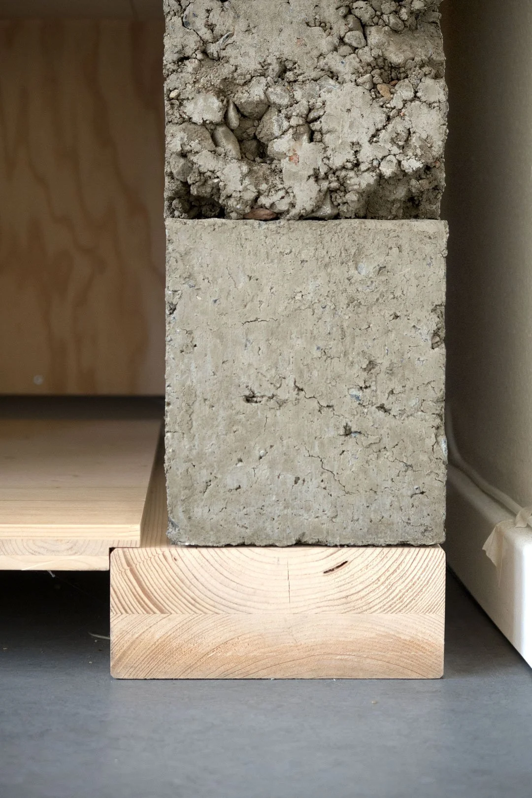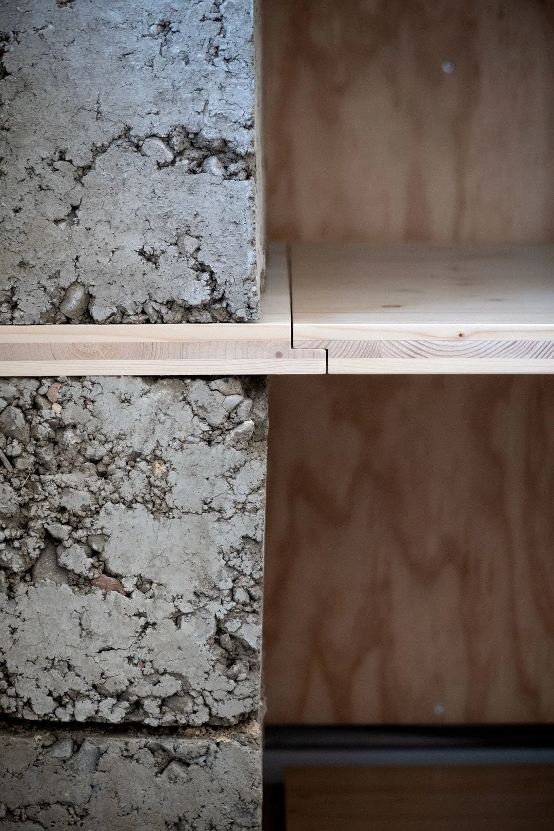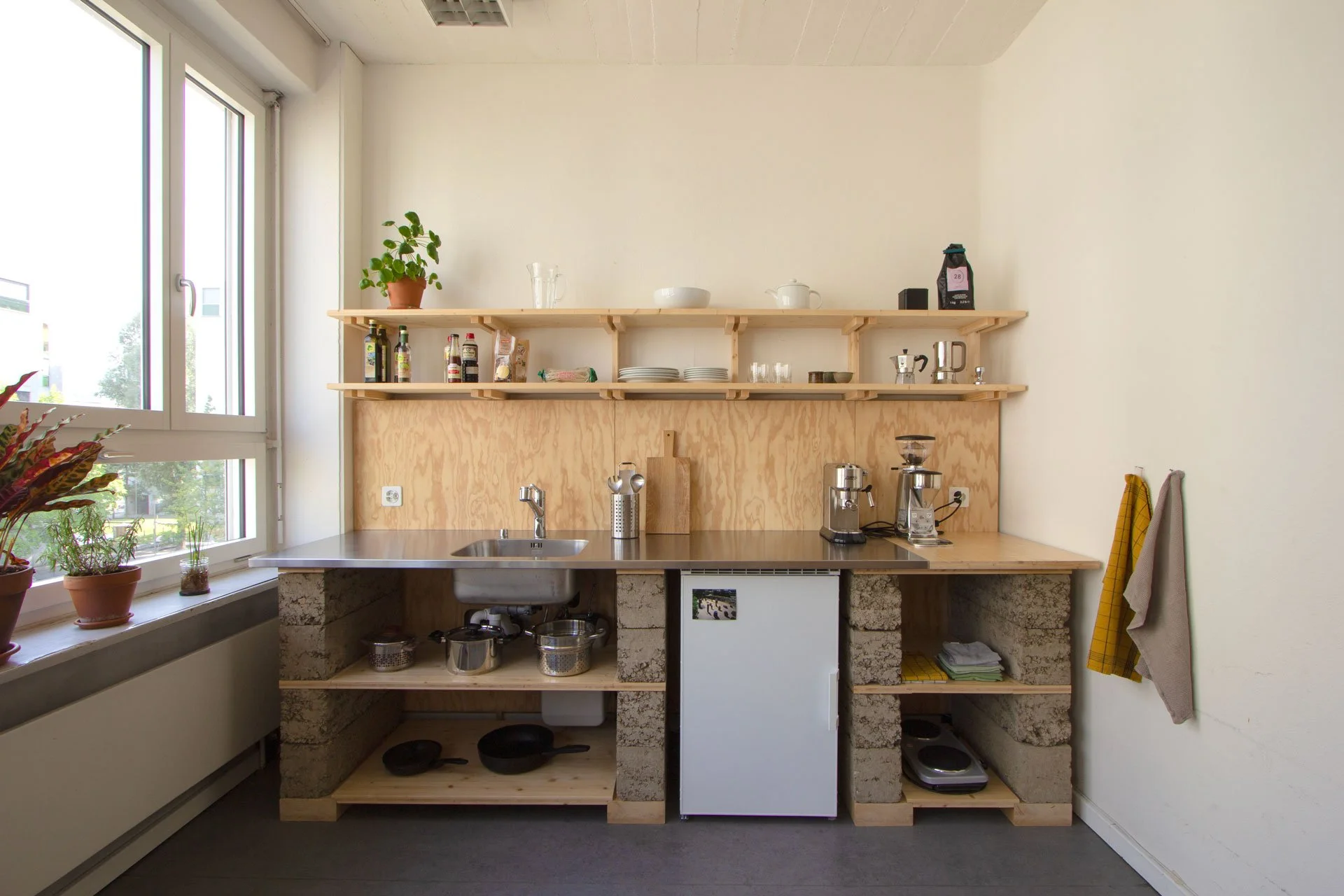 Geschichtete Lehmblöcke, dazwischen Tablare und als oberer Abschluss eine im Bauteilladen gefundene Chromstahlarbeitsplatte, das war die Grundidee dieser einfachen Küche. In der Umsetzung stiessen einige Elemente und Herausforderungn dazu.