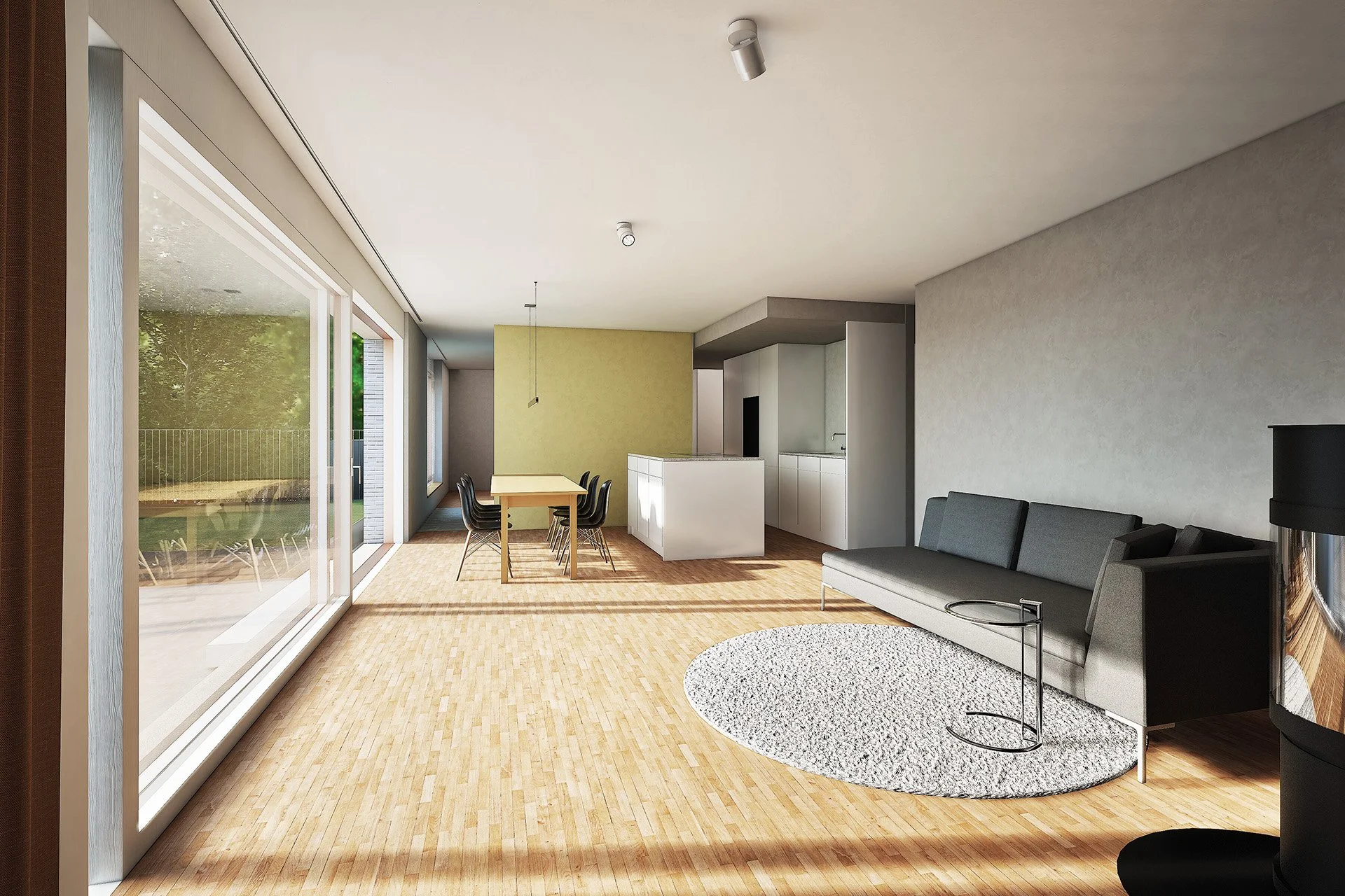 Der skulptural geformte Baukörper schmiegt sich entlang der nach Westen abfallenden tiefen Parzelle. Die Länge wird in den Wohnungen erlebbar und und ermöglicht Weitblick innerhalb und durch das Haus.